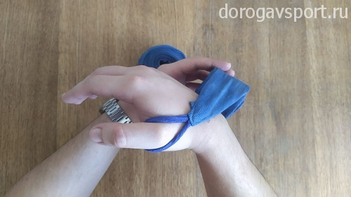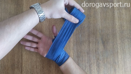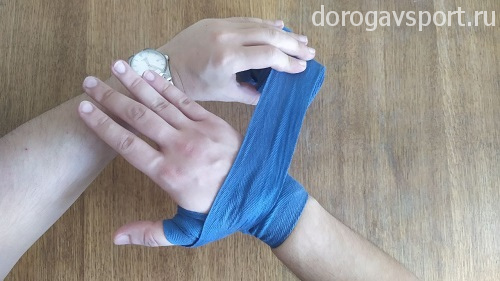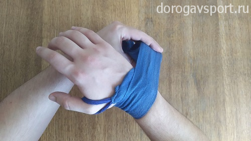 Оставшейся частью бинта можно дополнительно зафиксировать большой палец или запястье, но ни в коем случае больше не накладываем его на боевые поверхности. Фиксируем бинт в запястье на липучку.
