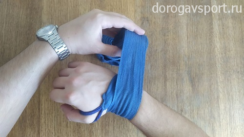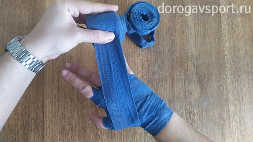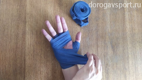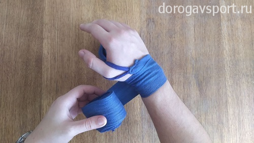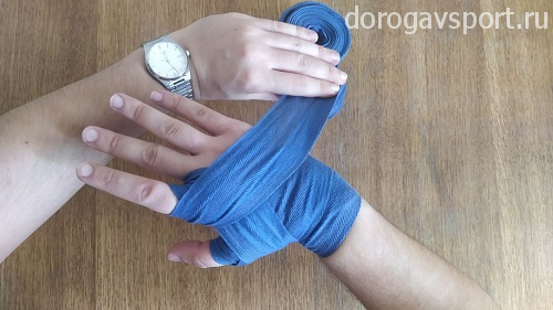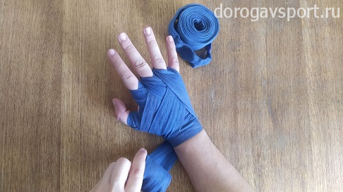 Сразу очень важный момент: после надевания петельки на большой палец бинт должен проходить с внешней стороны кисти, уходя к запястью. Натягивать при этом бинт нужно довольно сильно, чтобы чувствовалось давление на большой палец. Такое положение дополнительно фиксирует кисть при сжатии кулака, обеспечивая более надежную защиту рук.